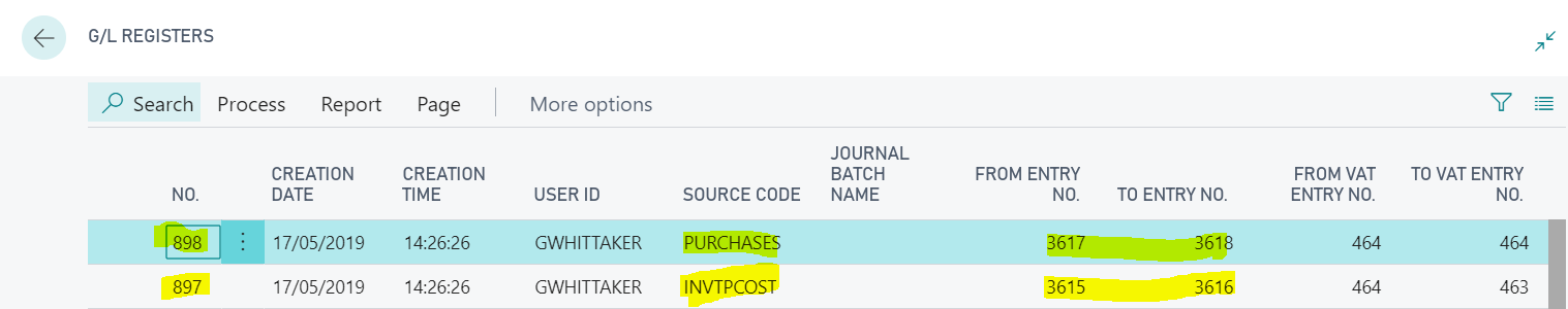 When posting a Purchase Invoice for an Inventory Item and viewing the G\L Register one thing stood out. Instead of one set of G\L Registers for the transaction there were two? Furthermore, one set of G\L registers had a Source Code of PURCHASES (G\L Register No 898) and the other set of G\L registers had a Source Code of INVTPCOST (G\L Register No 897)