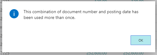 You are then presented with the message “This combination of document number and posting date has been used more than once.”
