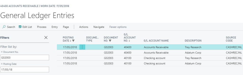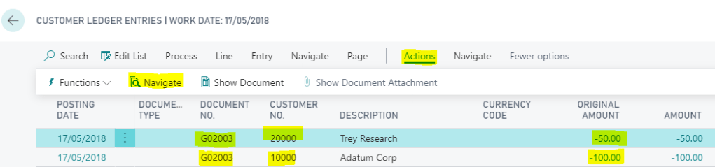 After posting them go to “Customer Ledger Entries” and highlight one of the entries and click “Actions > Navigate” as per below