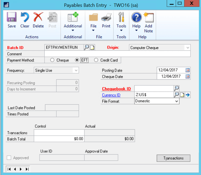 A client reported that when posting a EFT payables payment run the payments weren’t hitting the bank management reconciliation window. i.e. by EFT I mean they select “EFT” on the payables batch as per below: