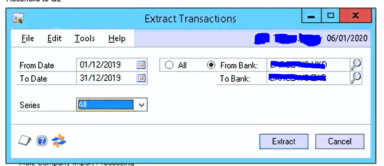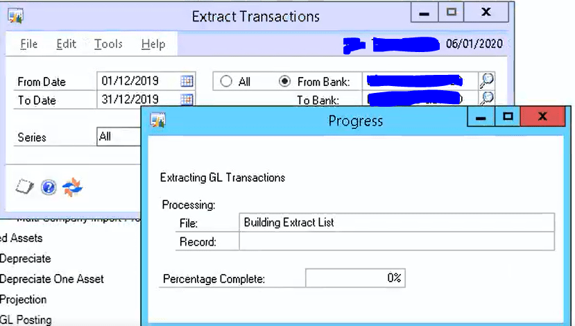 The issue was occurring when running an “Extract” routine in the third party module Nolans Advanced Bank Reconciliation. This routine extracts all the data from the GL into third party tables based on parameters specified by the user.