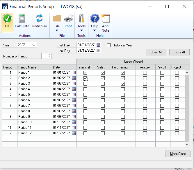2. You can close the financial period for one series, (or ledger) while leaving another series open. For example, in the configuration above you can post a Sales transaction with a GL posting date of March, however you can’t post a Purchasing transaction with a GL posting date of March as that has been closed.