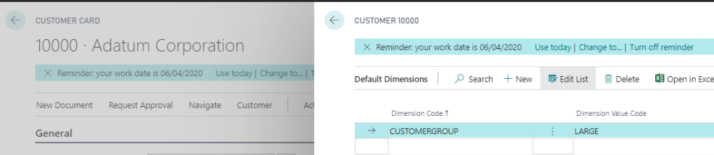 I can then assign dimensions at Customers/Suppliers/GL Code level to add my extra analysis. For example I’ve assigned the dimension “Customer Group” to the customer below with a value of “Large”. (you can also edit the analysis prior to posting)