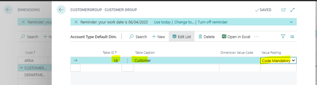 Finally, you can also set code mandatory or defaults at the table level for speed of setup. For example, I could setup a default for the customers table, so all customers require analysis. i.e. below I’ve set the system so every customer needs analysis to the CUSTOMERGROUP dimension