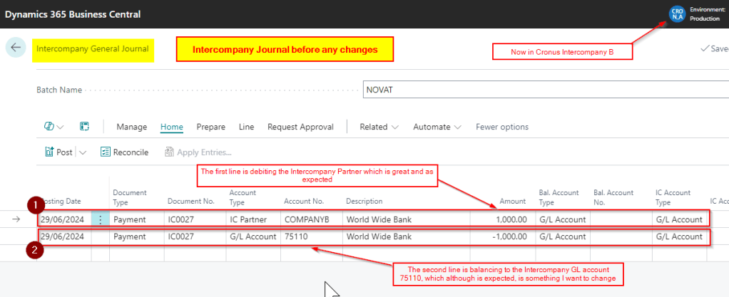 Once this has been posted we can log into “Cronus Intercompany A” and the Intercompany Journal is initially showing as per below: