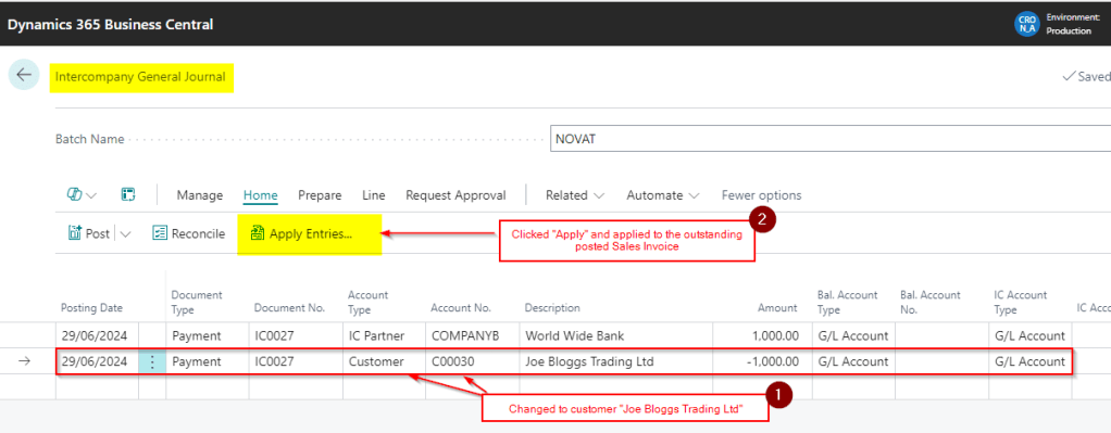 The payment to pay the Sales Invoice is then deposited by “Joe Bloggs Trading Ltd” into the bank account of “Cronus Intercompany B” rather than “Cronus Intercompany A”.
