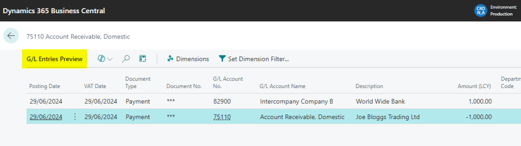When I look at the General Ledger Entries I can see this is hitting the Intercompany GL Account and also Crediting my Accounts Receivable (Debtors Control)