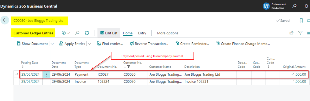 This shows outstanding in the Customer Ledger Entries on the account of “Joe Bloggs Trading Ltd” in Cronus Intercompany A.