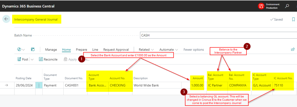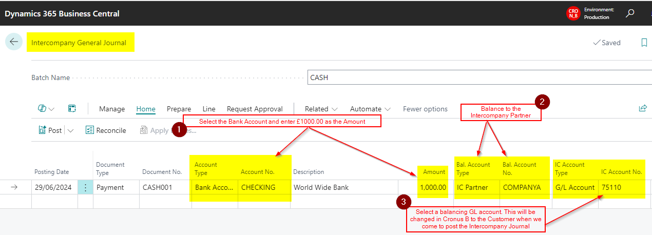 Therefore we will first record the cash in Cronus Intercompany B, using an Intercompany Journal as per below: