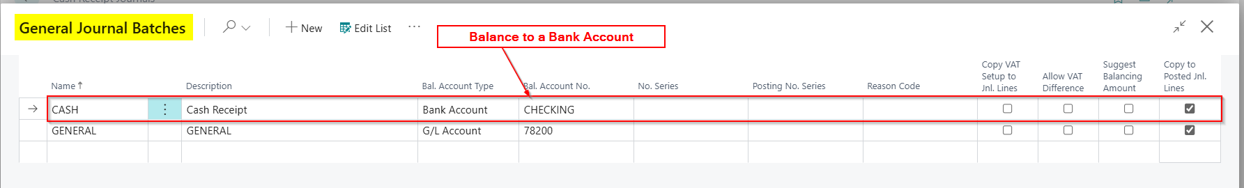 There is one important note to this process. If you want to use the “Bank Reconciliation” feature of Business Central you must balance to the “Bank Account” rather than balancing directly to your Bank General Ledger code. This is because by balancing to the Bank Account the system will create “Bank Account Ledger Entries” that you can reconcile in the Bank Reconciliation.
