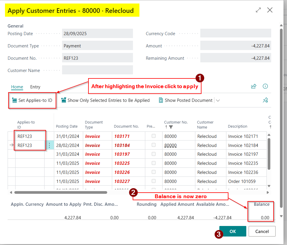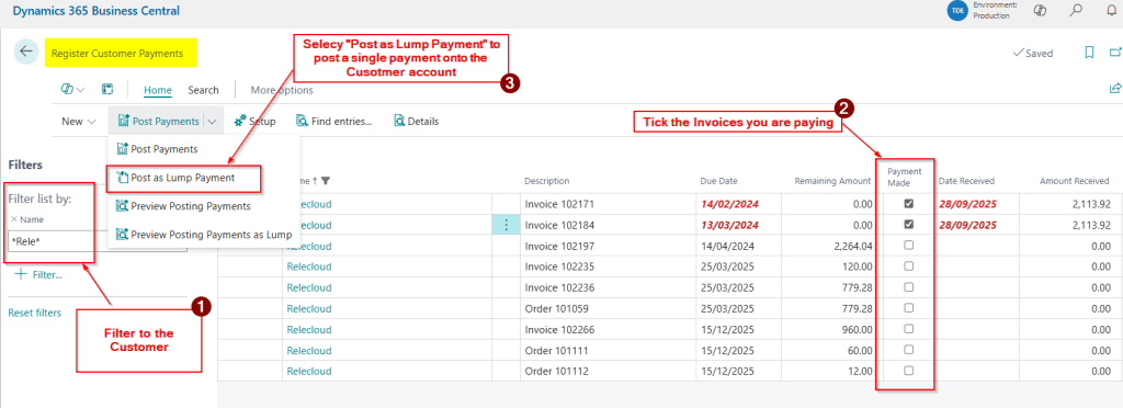 Note, when you open the page the system will initially list all outstanding transactions. I therefore filter to the Customer and then using the remittance tick the invoices that are being paid before selecting “Post as Lump Payment” to record the cash in Business Central.