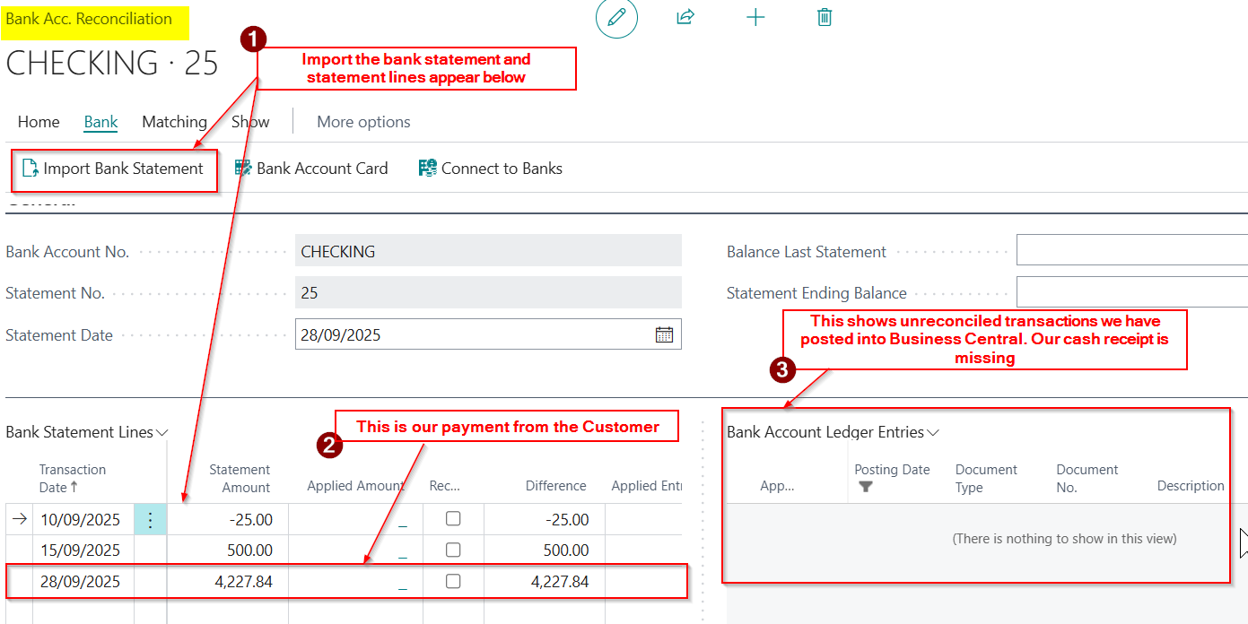 After importing the bank statement, we now have our Cash Receipt showing on the bank statement side (the left hand side) however this hasn’t yet been posted in Business Central, so there’s no corresponding “Bank Account Ledger Entry” on the right hand side.