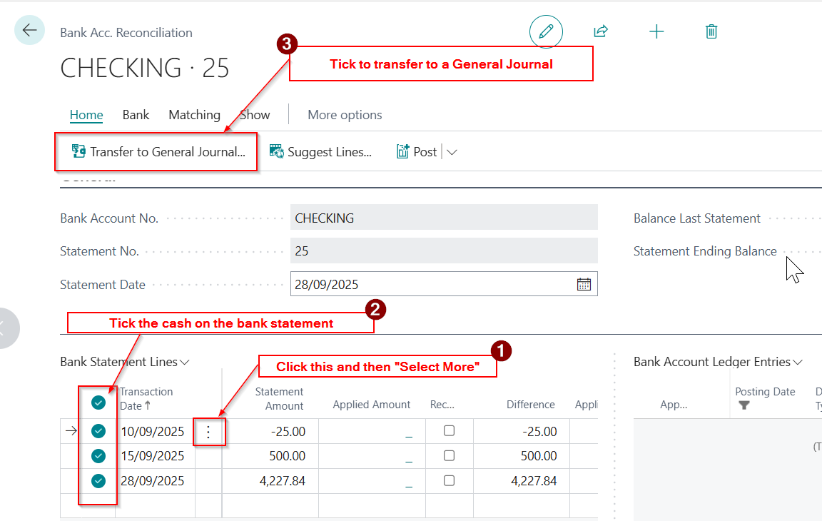 To do this we’ll select all three entries on the Bank Statement and select “Transfer to General Journal”