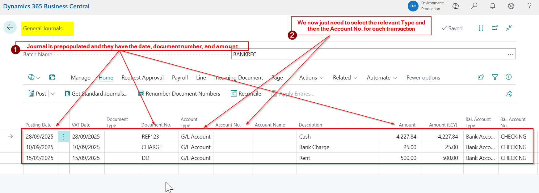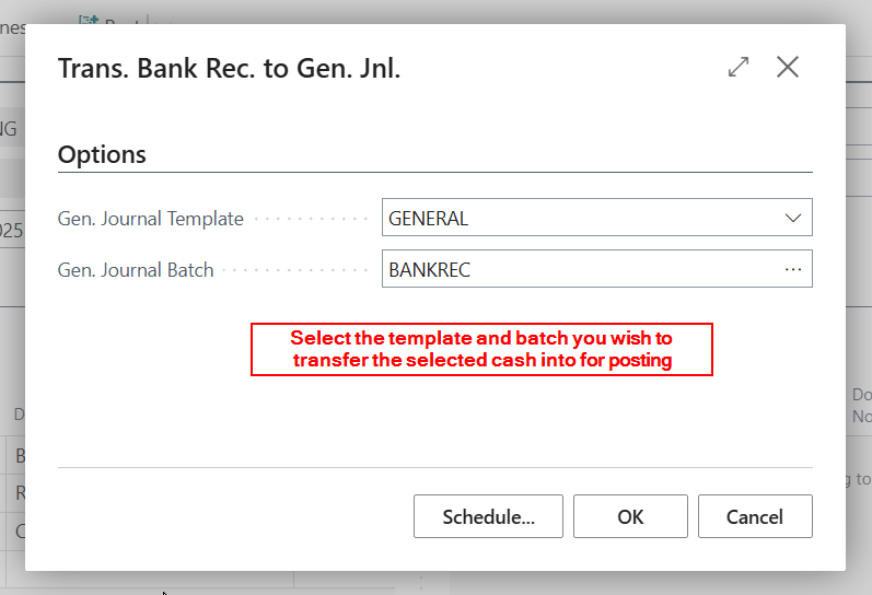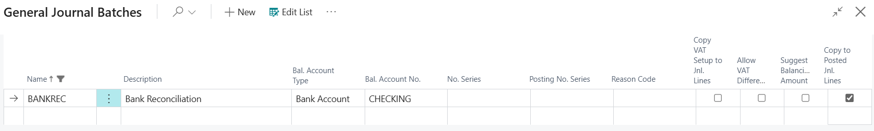 For clarity, you can click on the ellipse button next to “Gen. Journal Batch” and create a new batch. This is how I’ve configured my “BANKREC” batch