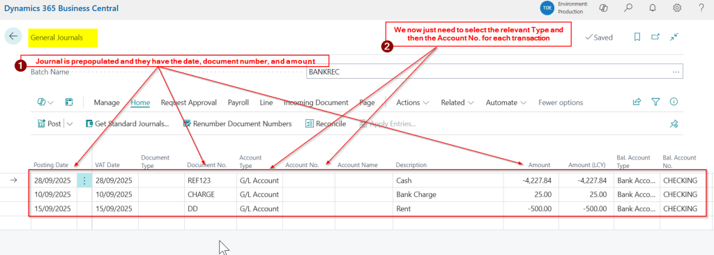 After clicking OK on the “Trans. Bank Rec. to Gen. Jnl.” page the system opens the “General Journal” page automatically and its prepopulated with the three transactions we highlighted.