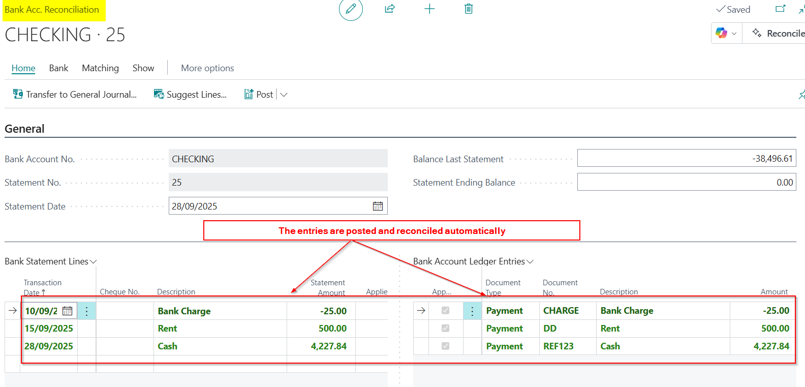 Finally, I can click “Post” to post the journal, and when I exit the “General Journal” page it takes me back to the Bank Reconciliation with both lines reconciled.