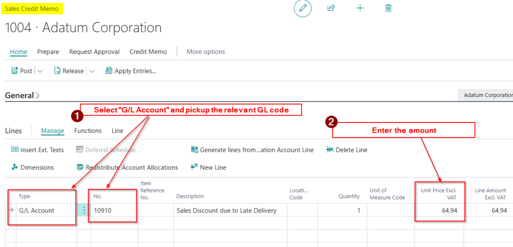 First, we will create a Sales Credit Memo using a G/L account.