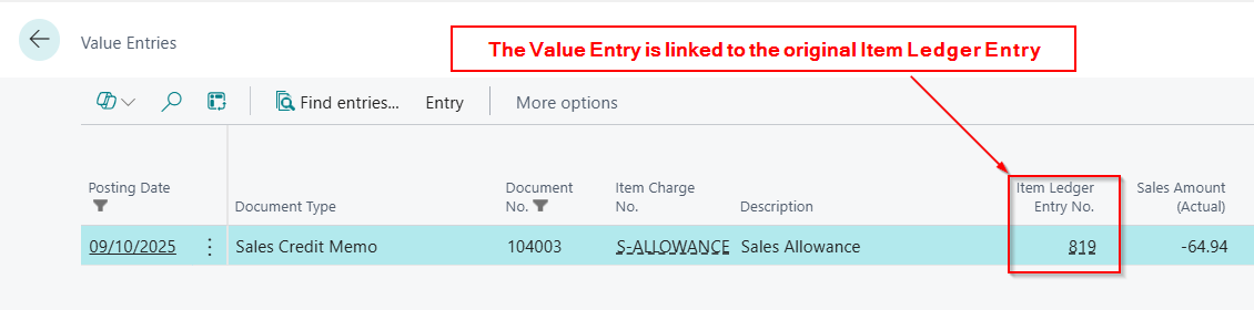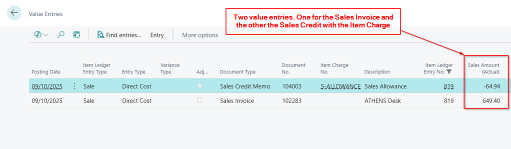 We then looked at using an Item Charge, which we linked to the original Sales Shipment. This ensures the Sales Credit is reflected in the Value Entries and accurately adjusts the “Sales Amount (Actual).”