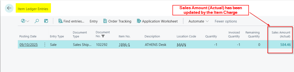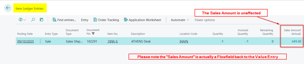 Therefore although the ledgers are correct, as the GL Entries have hit the relevant accounts, and the Customer Ledger Entry was created, if we look at the original Item Ledger Entry the “Sales Amount (Actual)” is unaffected.