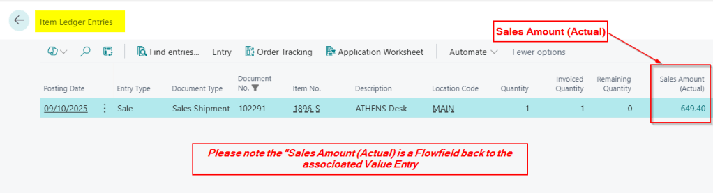Please note the “Sales Amount (Actual)” shown on the Item Ledger Entry is actually a Flowfield that links (flows) back to the Value Entry. The Item Ledger Entry records the Inventory quantity movement for the transaction, whereas the Value Entry records the Inventory Values for that movement.