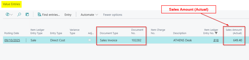 The Sales Invoice has also created the following “Value Entry”, which records the “Sales Amount (Actual)” which is linked to the above Item Ledger Entry