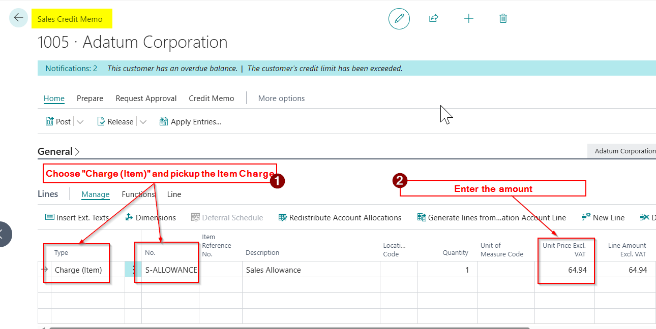 I’ll now create a new Sales Credit Note and pickup the Item Charge and enter the amount.