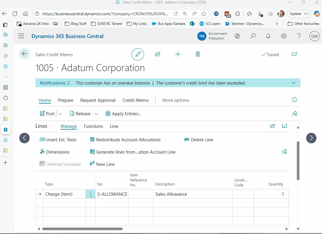 To raise the Credit Note, I’ll go to “Sale Credit Memo” and select the relevant Customer and enter the line as per below.