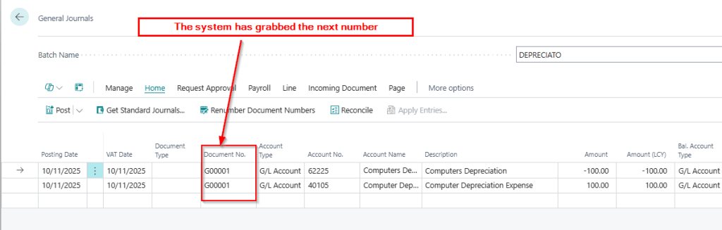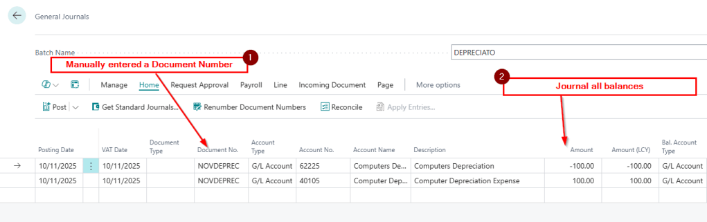 Here I have a journal batch for Depreciation. Everything looks fine, I’ve entered a Document Number and the journal balances.