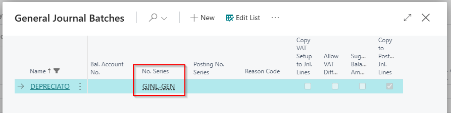 Here we can see that the batch has been assigned the No. Series “GJNL-GEN” so let’s go to the “No. Series” page and take a closer look at its configuration.