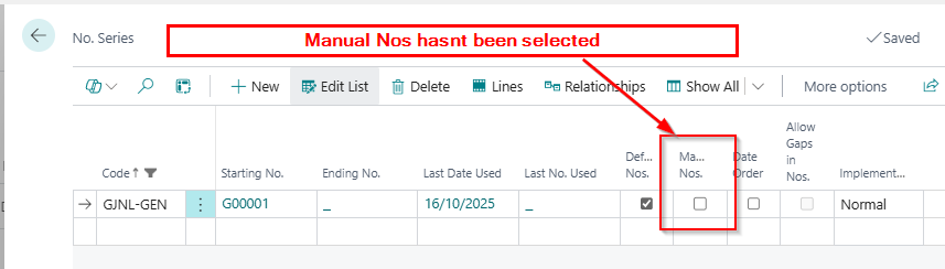 Straight away I’m seeing that “Manual No’s” has been switched OFF on the batch. This means that as this Number Series is assigned to my batch, I can’t enter my own number in journals in this batch.