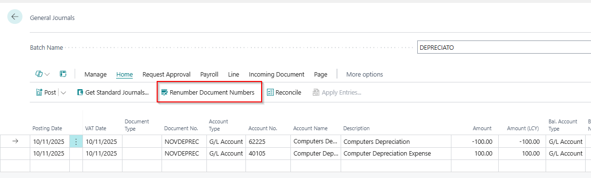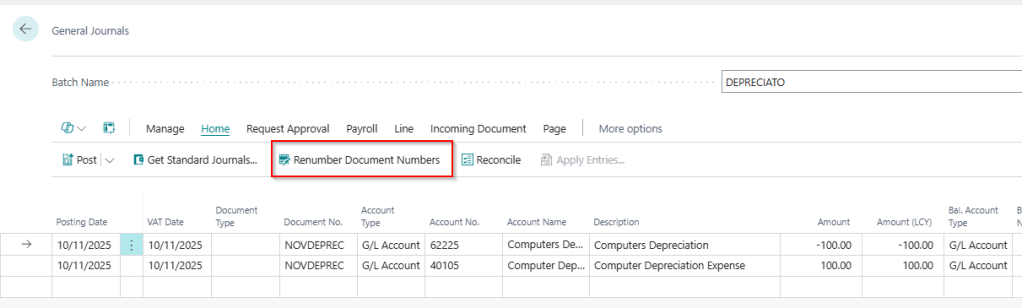 Going back to my batch, I’ve explicitly given the journal my own Document Number of “NOVDEPREC”. However, as we have seen, the Number Series assigned to my batch doesn’t allow Manual No’s.