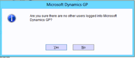 Ensure there are no users in Dynamics GP and click “Yes” to the message below. (rather than asking everyone to log out I usually just ensure there’s nobody doing any Bank Management activities)