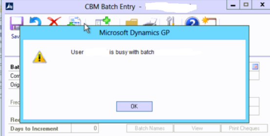 However I found I still couldn’t access the batch. On investigation there is still some activity for the batch in the CBEU1020 table which needed clearing. I therefore ran the SQL query below in the company database to delete the row. (replace TWO18 with the name of your company database)