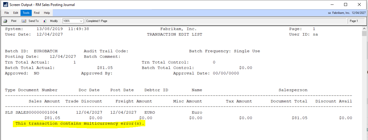 ** Please note you may only have one rate type in your system. My example is based on adding a new currency for use in the Fabrikam demo company which has three rate types.