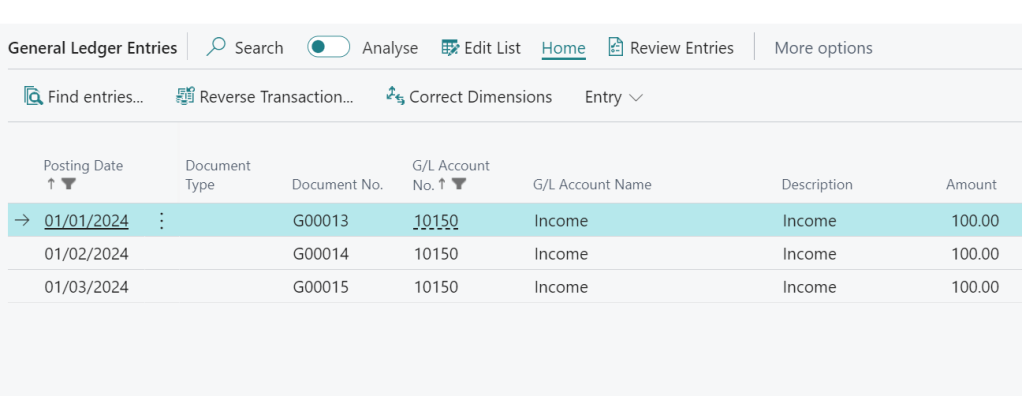 Now, when I open my General Journal page, I can see the SEASON dimension alongside the DEPARTMENT and CUSTOMERGROUP dimensions.