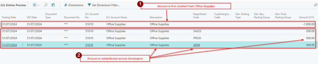 In my company, I’ve only added DEPARTMENT and CUSTOMERGROUP as shortcut dimensions, which is why those are the only ones I can see on the journal lines: