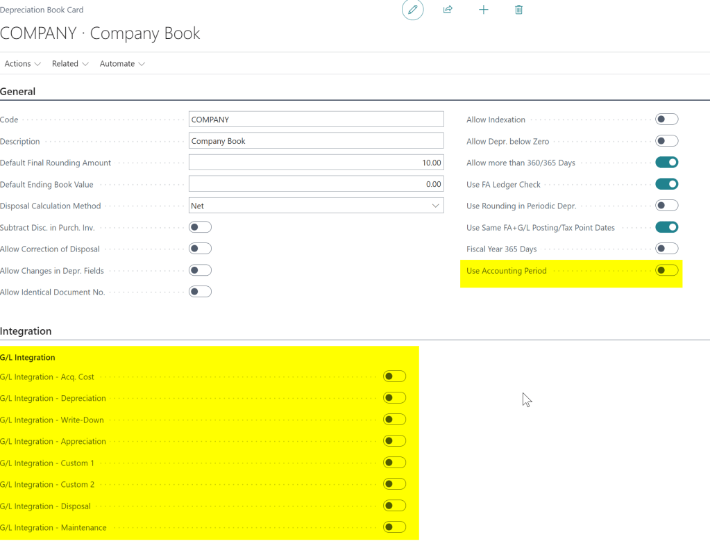 The next thing to do is to ensure the option “Use Accounting Period” is off in the Depreciation Setup and also switch off the GL Integration.