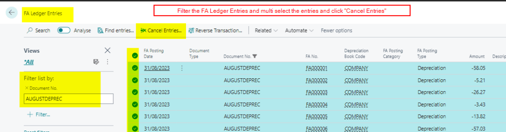 For example, below I’ve filtered on the “AUGUSTDEPREC” document number and then selected all the entries and clicked “Cancel Entries”.