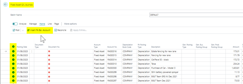 Although this would create me a Fixed Assets G/L Journal to cancel the entries, it wouldn’t automatically populate the balancing account. I’d then have to open the “Fixed Asset G/L Journal” page and highlight all the rows and click “Insert FA Bal Account”