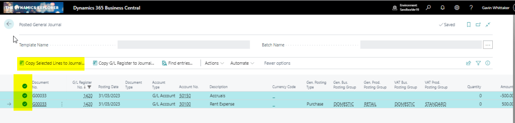 I therefore filter on this document number and select both lines and choose “Copy Selected Lines to General Journal” as per below: