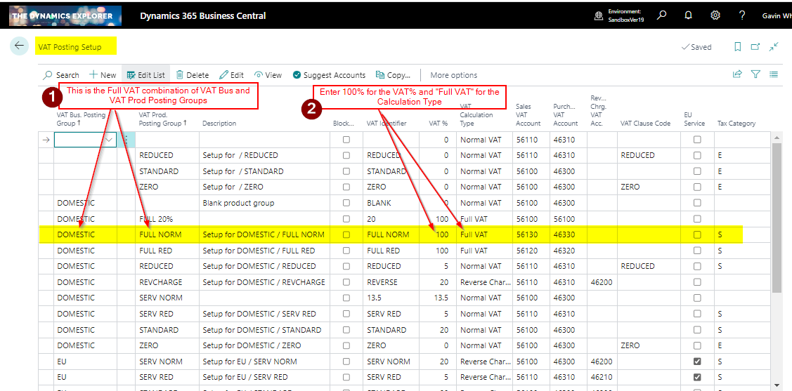 2) Then I’m selecting the relevant VAT Business and VAT Product Posting Group for the Full VAT combination