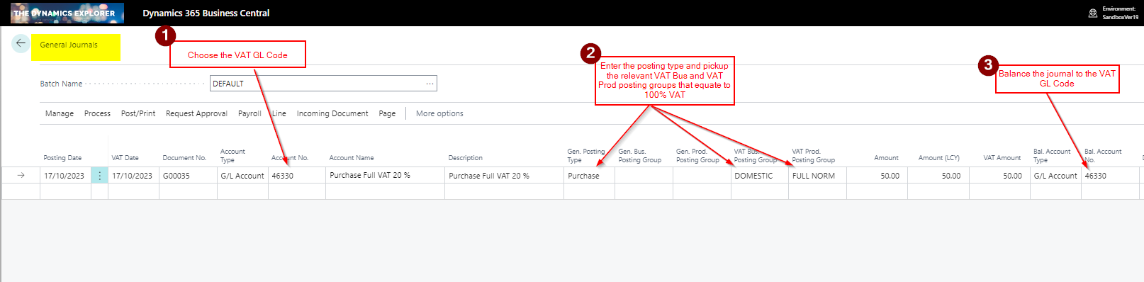 Now the VAT Posting Setup is complete, I’ll post the correcting VAT adjustment journal using the “General Journal” page as per the screen shot below.