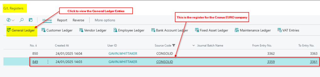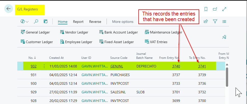 When I post this as well as the “General Ledger Entries”, I also get the G/L Register below.