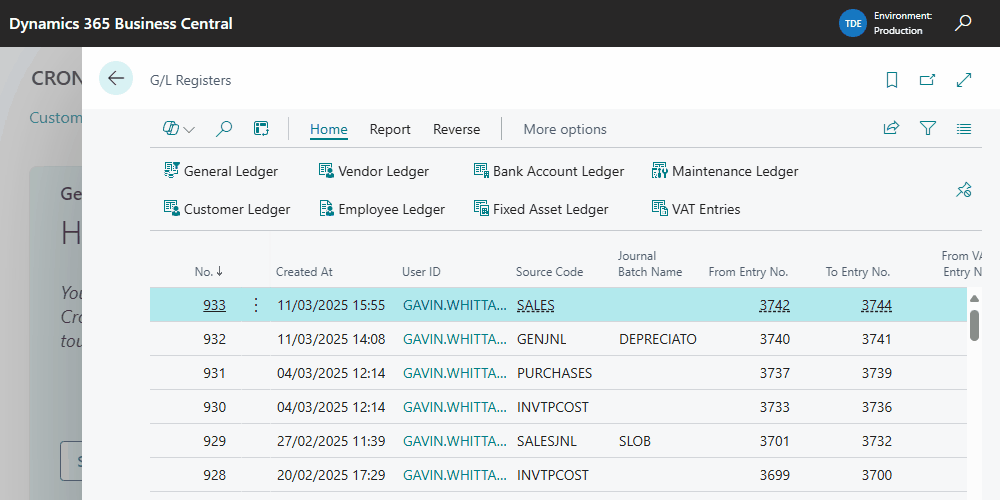 For example, I’ve now posted a Sales Invoice which has created a new G/L Register. From this register I can click “Customer Ledger” and “General Ledger” to view the relevant entries.