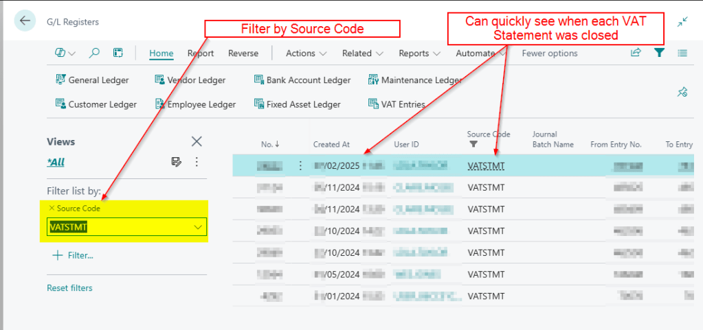 To do this, you simply apply a filter on the relevant “Source Code”. In the example below, I’ve filtered on the Source Code “VATSTMT” to check when the VAT was closed.