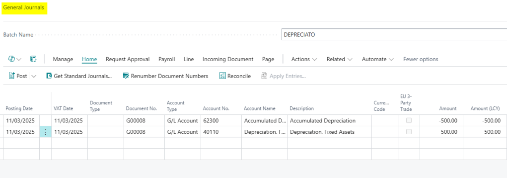 For example, below is a manual depreciation journal entered via the “General Journal” page.