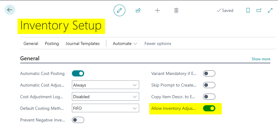 Firstly, if you want the ability to quickly adjust inventory on the Item Card, you must enable the option below in the “Inventory Setup” page as per below.