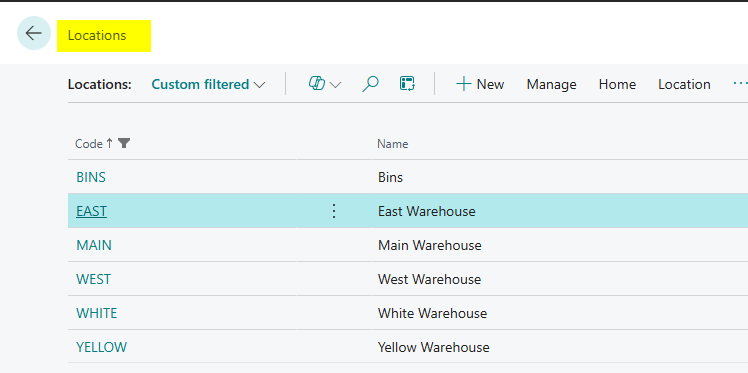 Before we make the adjustment, let’s take a look at my list of locations. Therefore I’ve opened my “Locations” page and here you can see I have locations called BINS, EAST, MAIN, WEST, WHITE and YELLOW.
