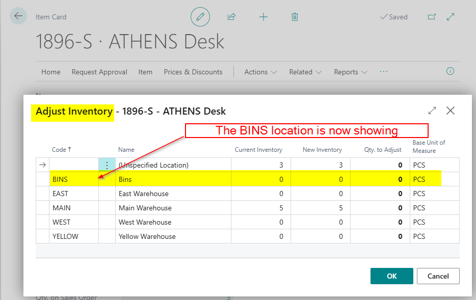 I want to make an adjustment to the Inventory level in the BINS location for Item 1896-S. I’ll therefore go to the Item card and click the option below
