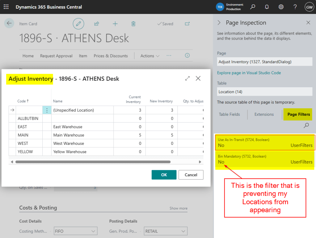 Therefore, I’ll return to my Item Card, click on the “Adjust Inventory” ellipse, and press CTRL+ALT+F1 to open the “Page Inspector”